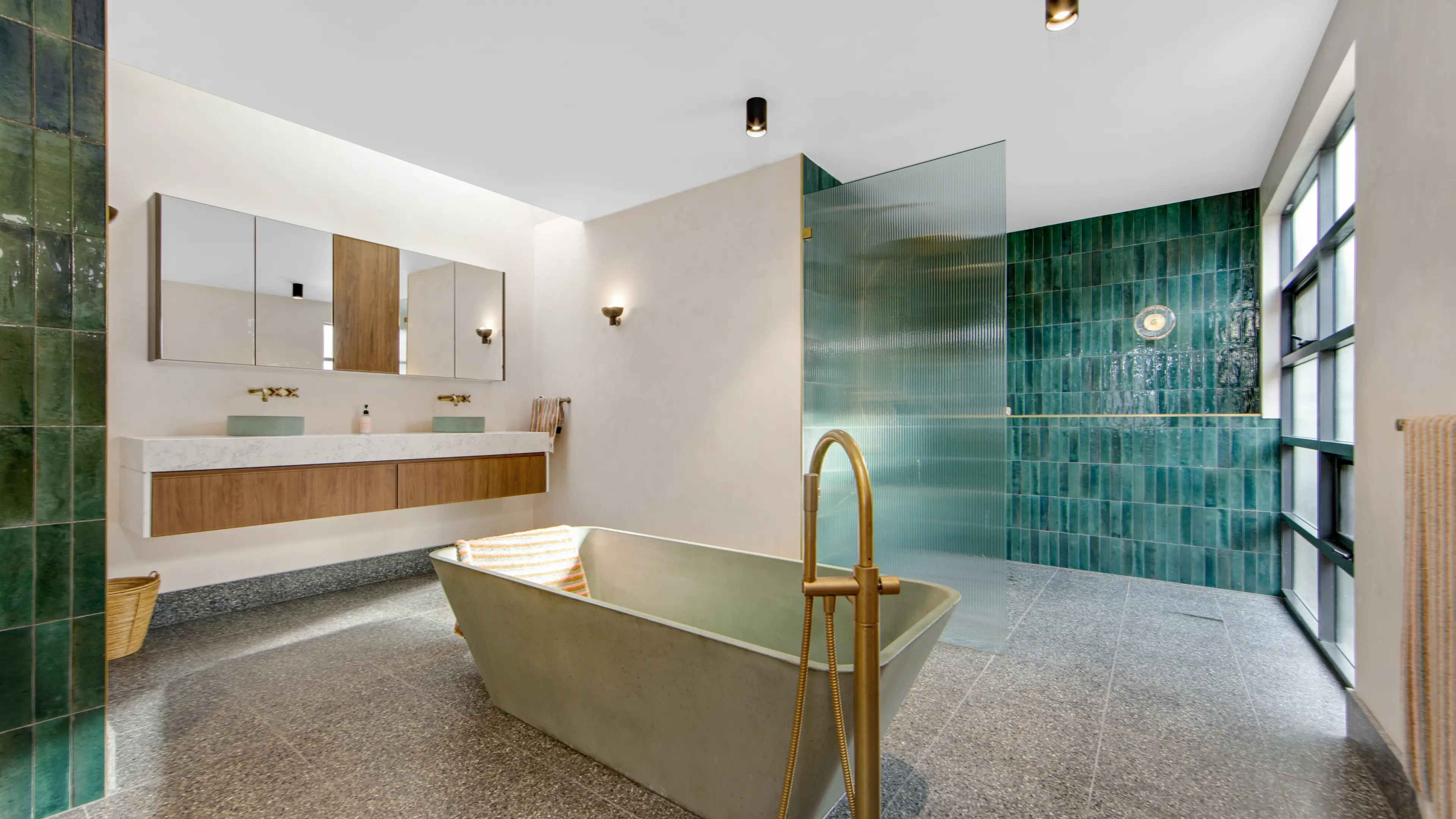 Inside, Venetian plaster walls create a refined, textured backdrop that enhances the home's aesthetic. The floating fireplace serves as both a focal point and a conversation piece while adding a modern, yet cosy touch to the living space. Rich earthy tones are found throughout, accentuated by rich wooden flooring and cabinetry with pops of colour across tiling, furniture and the stunning freestanding olive tub.